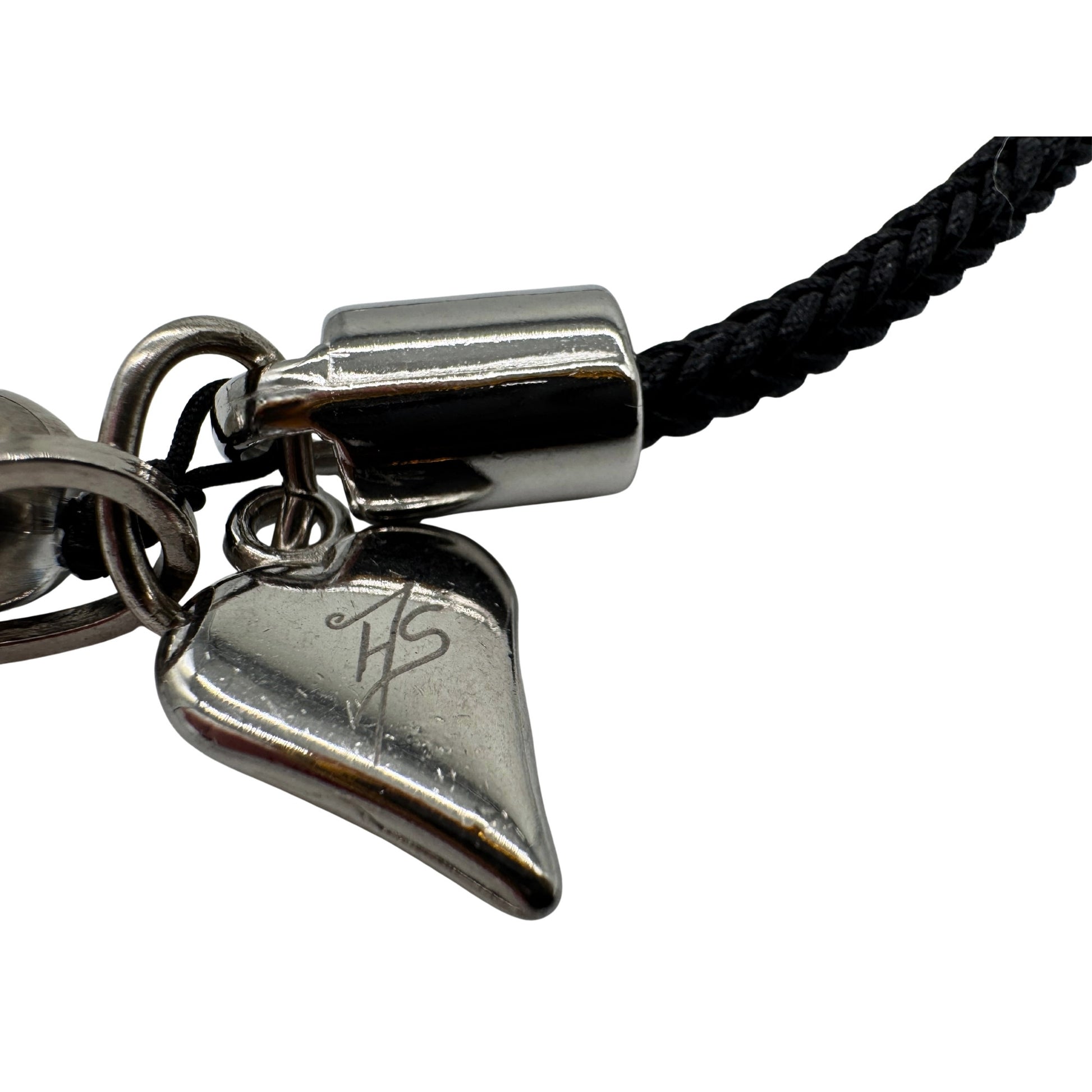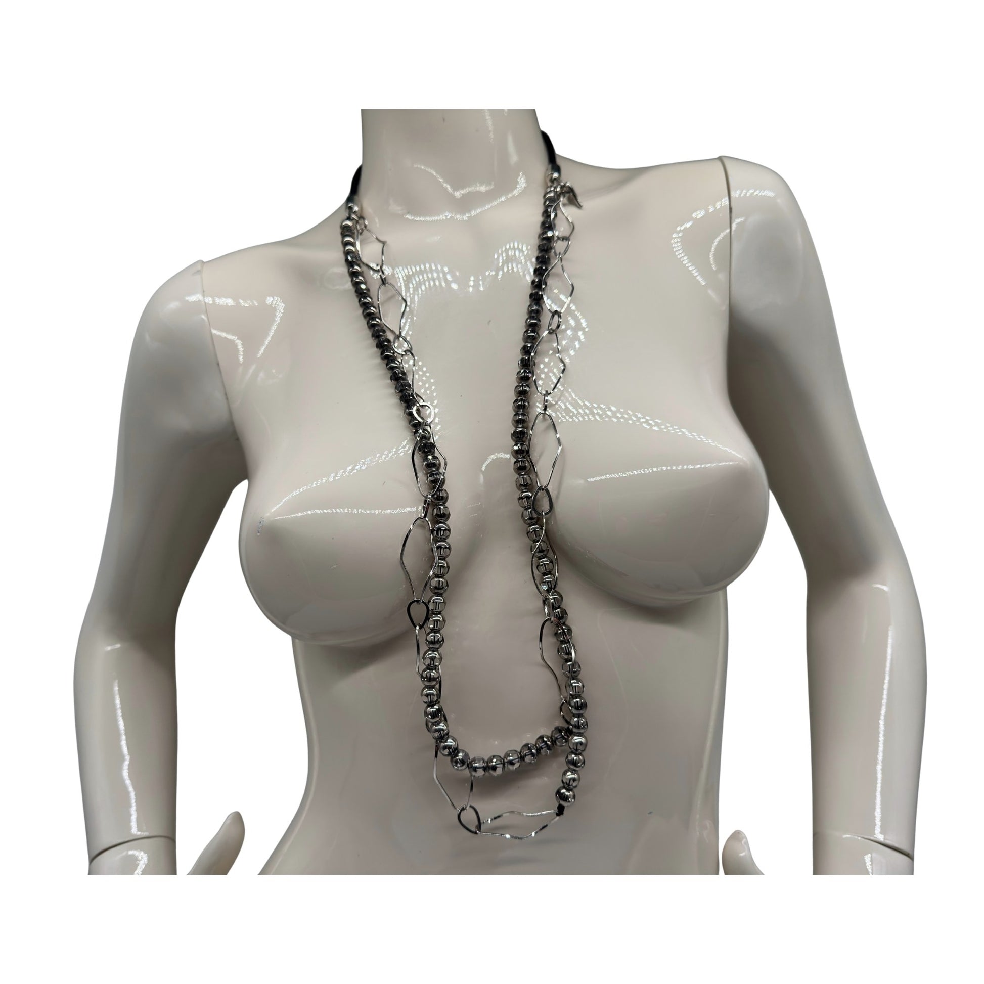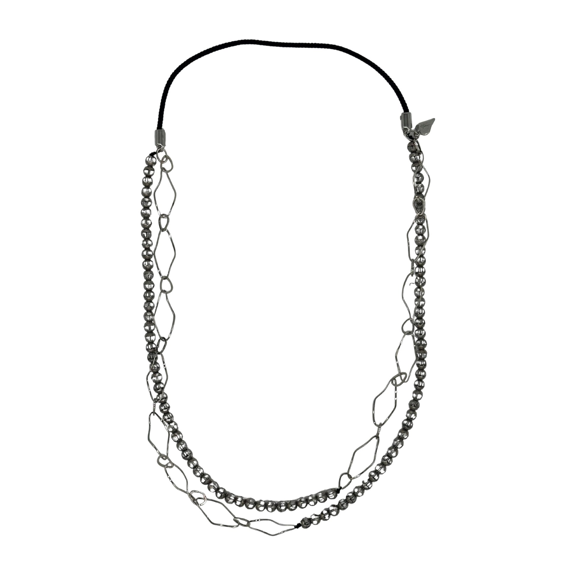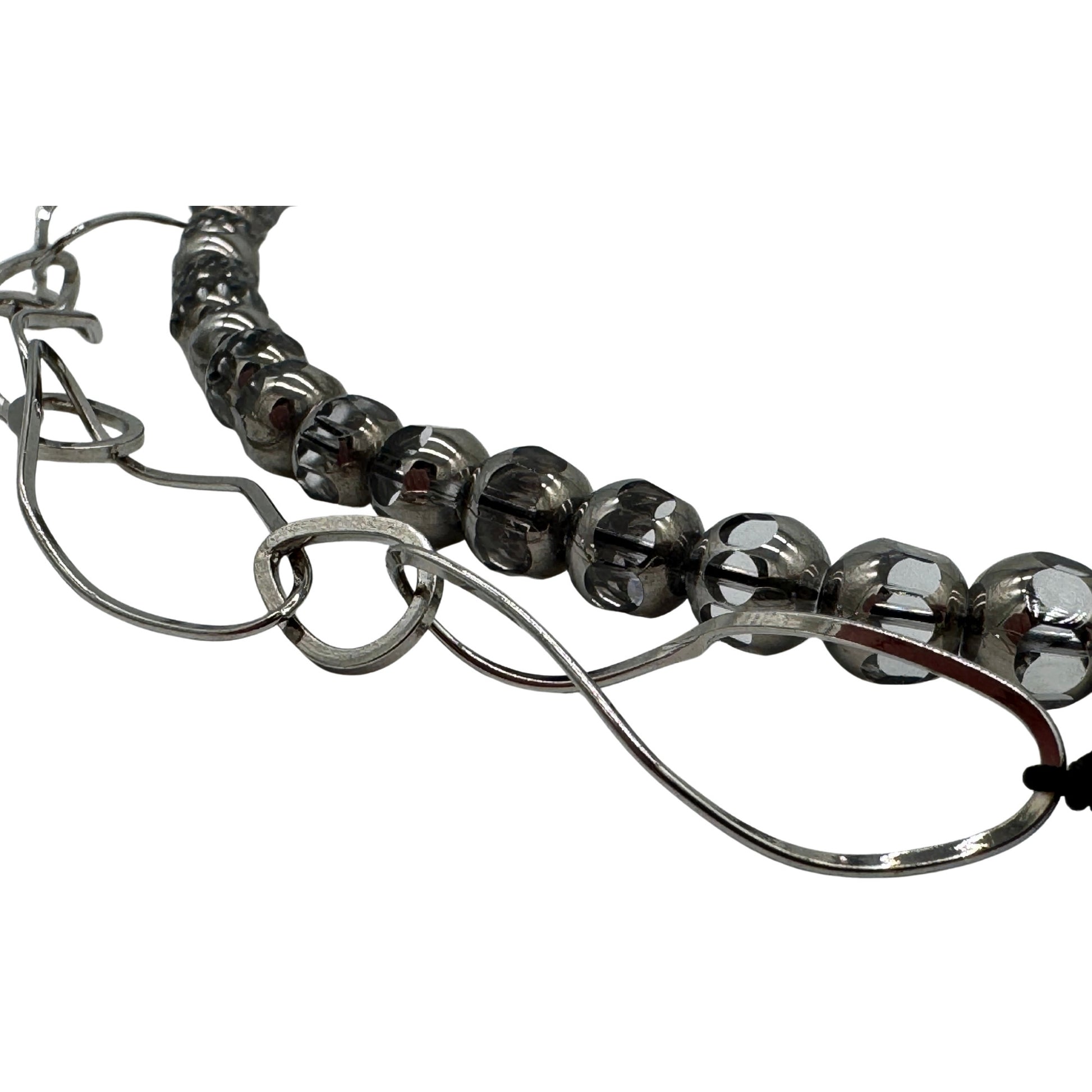 Handgefertigte Glaskette mit einer eleganten Kombination aus palladiumfarbener Metallkette, funkelnden Glasperlen und einem weichen Baumwollband. Die feinen Silbernuancen der Perlen erzeugen ein dezentes, edles Schimmern, während das flexible BW-Band der Kette einen modernen Charakter verleiht. Ideal für alltagstaugliche Looks oder elegante Outfits.