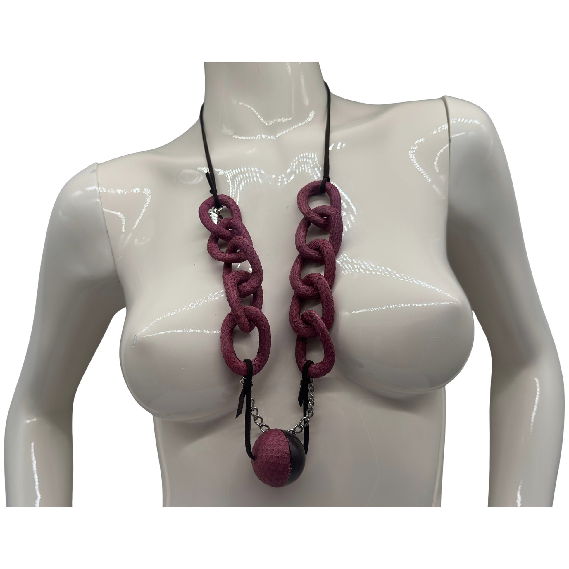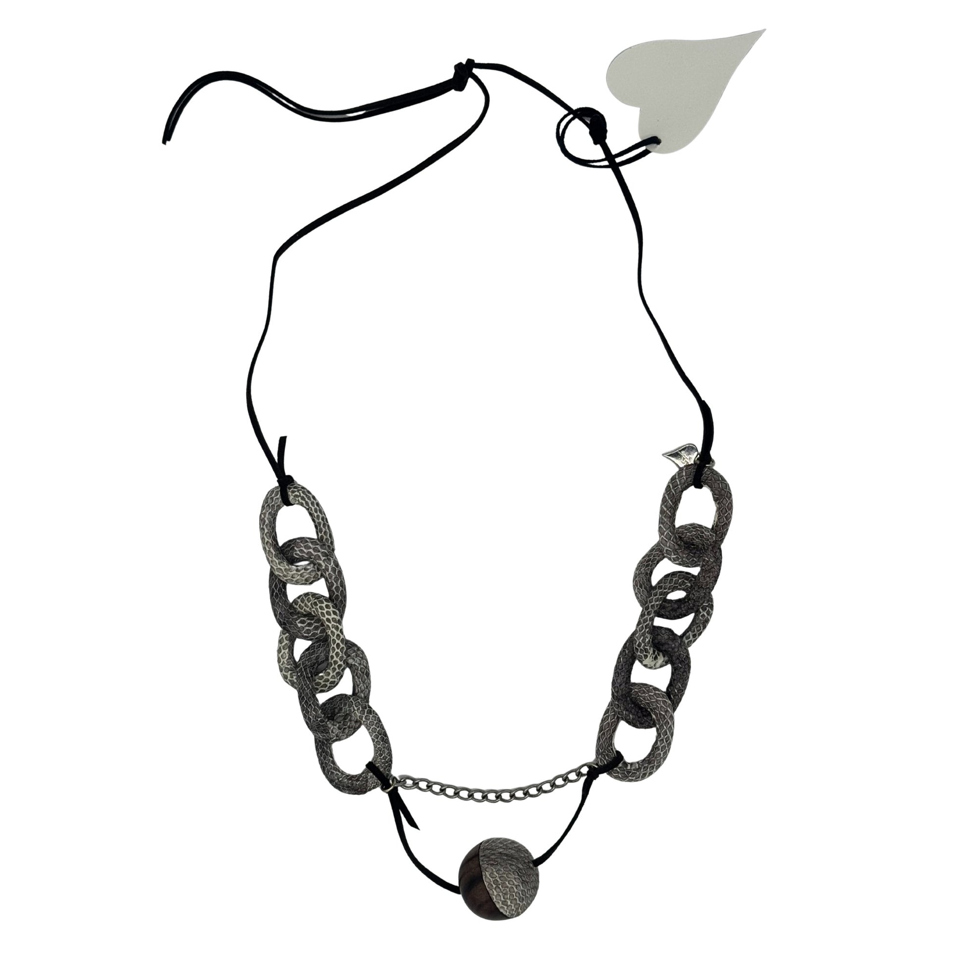 Handgefertigte Gliederkette aus natürlichen, hochwertigen Materialien. Die eleganten Kamagong-Holzglieder, umwickelt mit feiner Wasserschlangenhaut, kombiniert mit weichem Velourslederband und nickelfreien Metallteilen, verleihen der Kette eine besondere Textur und ein markantes, stilvolles Erscheinungsbild.