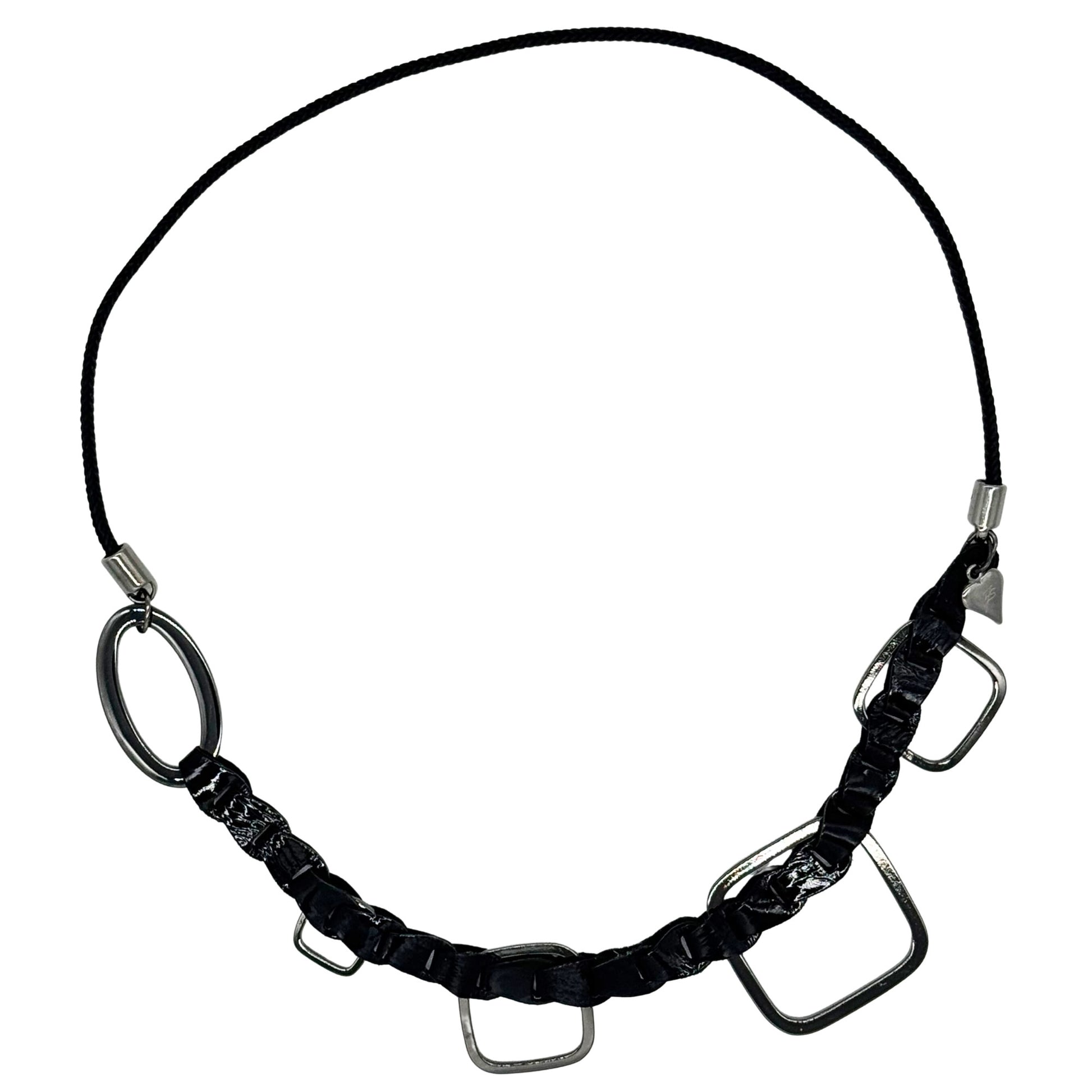 Handgefertigte Lederkette mit modernen Metallelementen. Das lackierte Echtlederband erzeugt eine glatte, hochwertige Oberfläche, während die glänzenden Metallringe einen markanten, urbanen Akzent setzen. Eine stylische Kette, perfekt für moderne und minimalistische Looks.