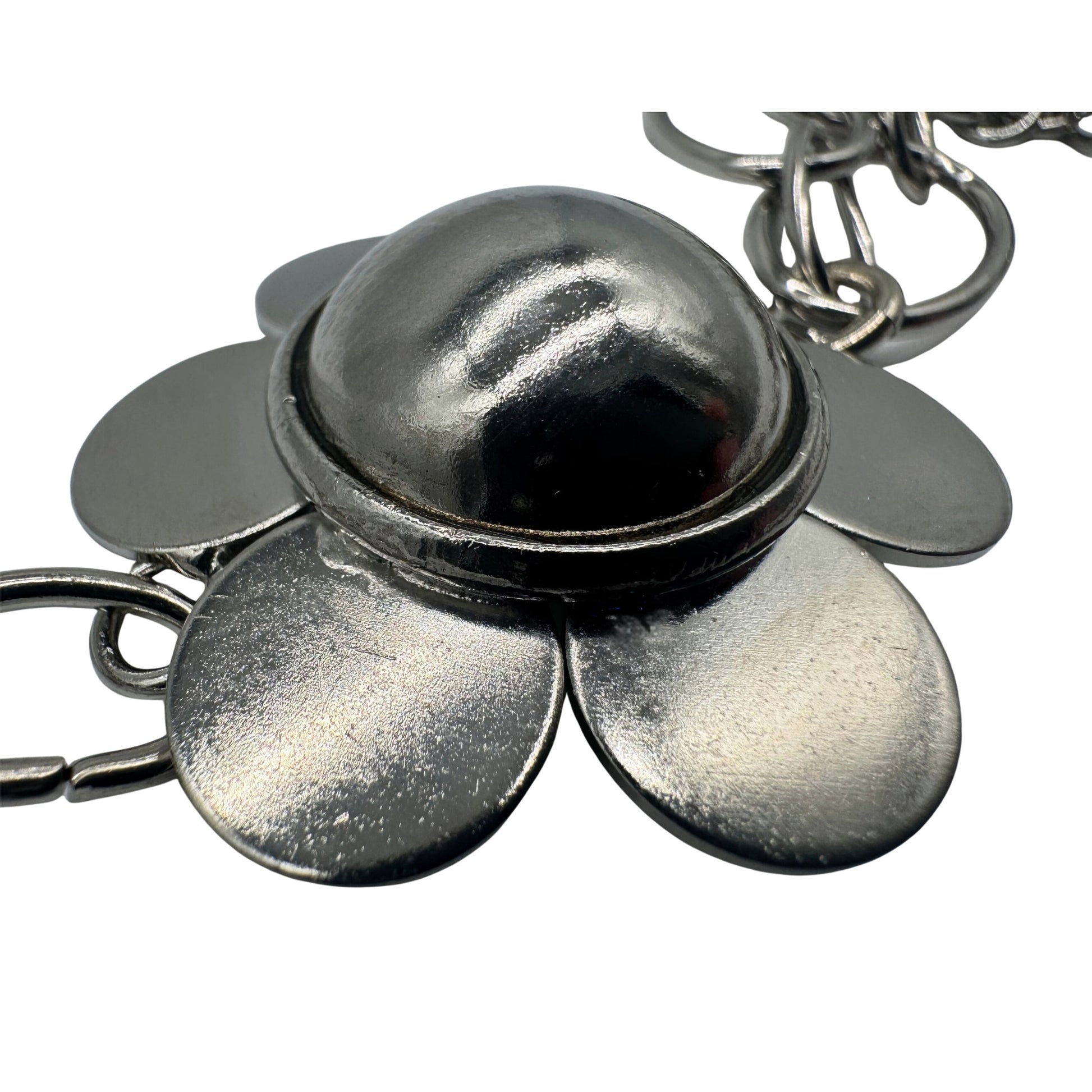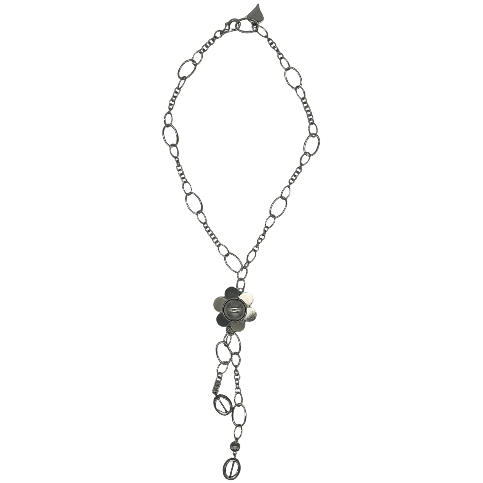 Handgefertigte Halskette mit einer dekorativen Metallblume als zentralem Element. Die edlen Glassteine mit feinem Silberüberzug setzen funkelnde Akzente, während die palladiumfarbene, nickelfreie Metallkette der Kette einen modernen, eleganten Charakter verleiht. Ein ausdrucksstarkes Design, das sowohl im Alltag als auch zu besonderen Anlässen wirkt.