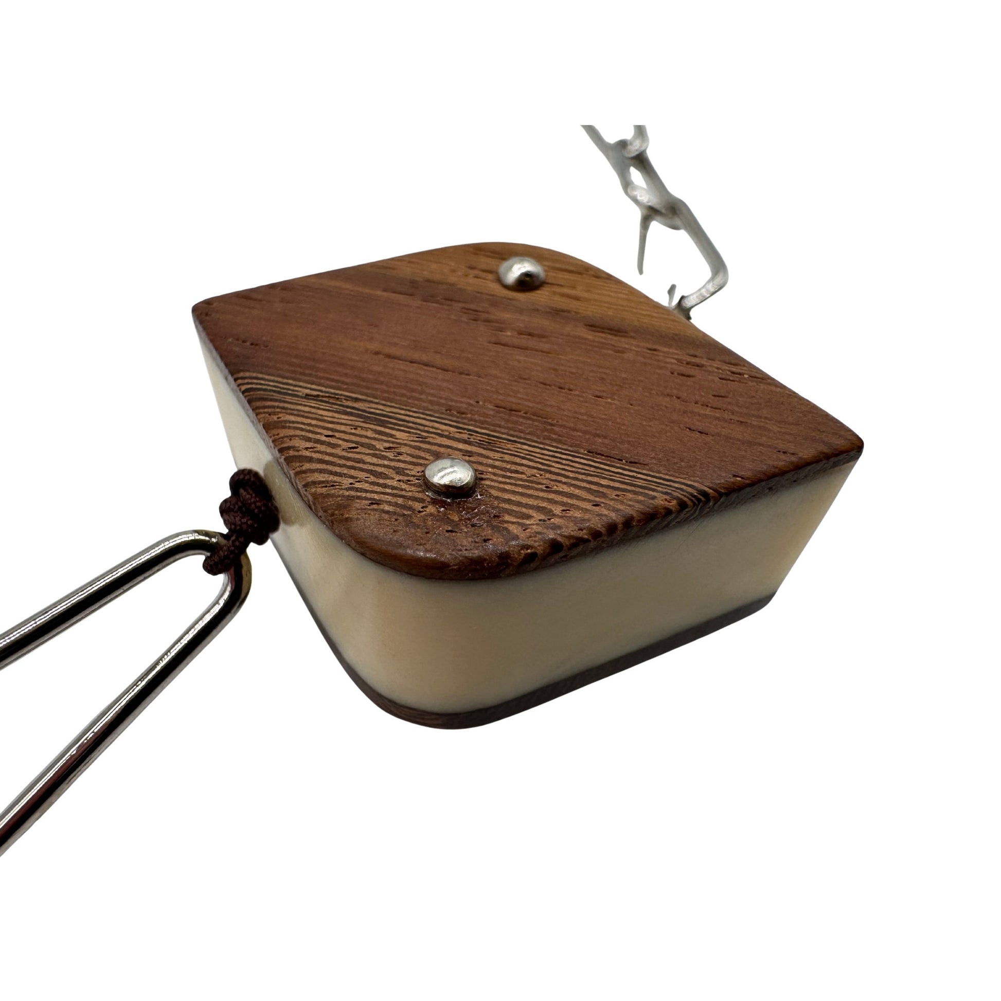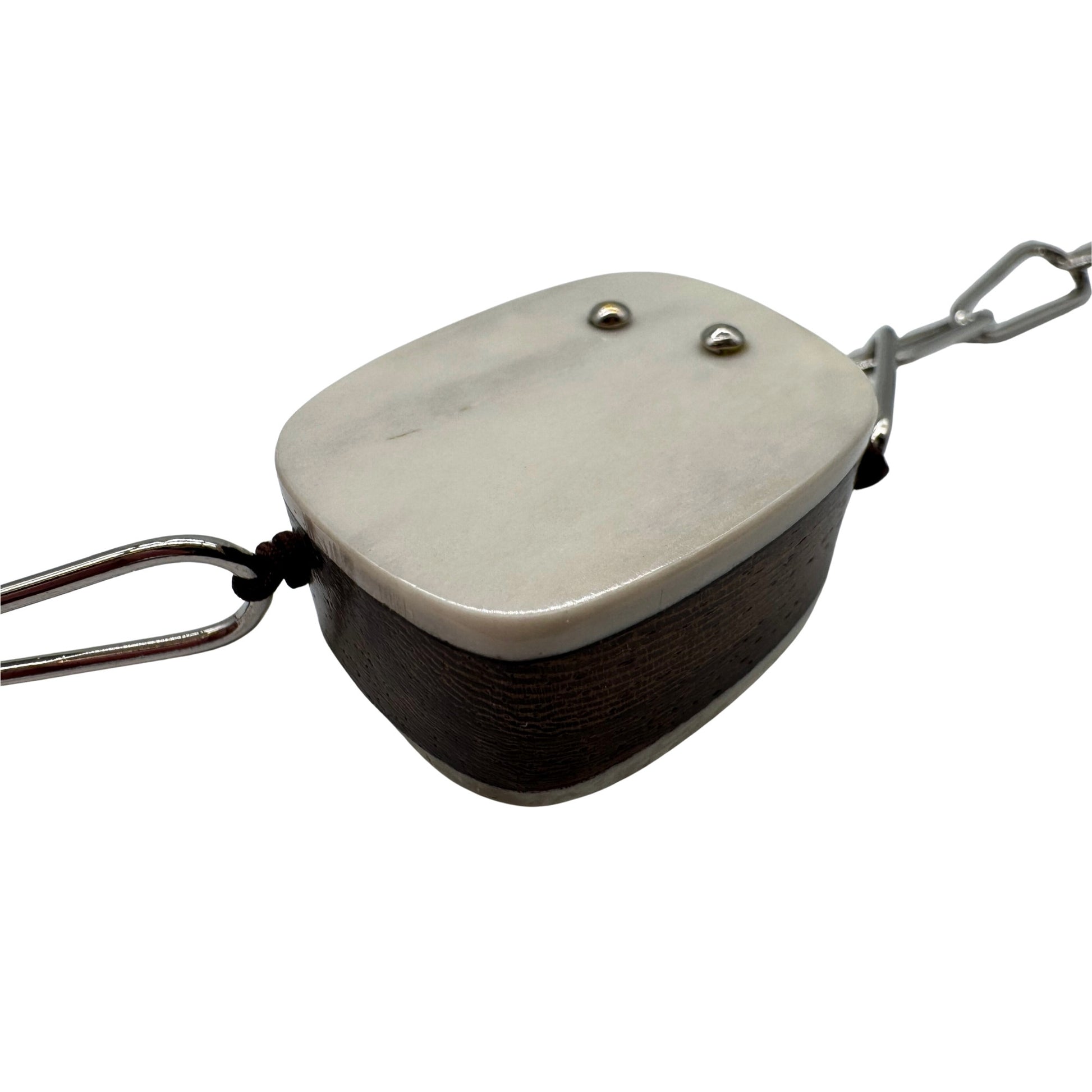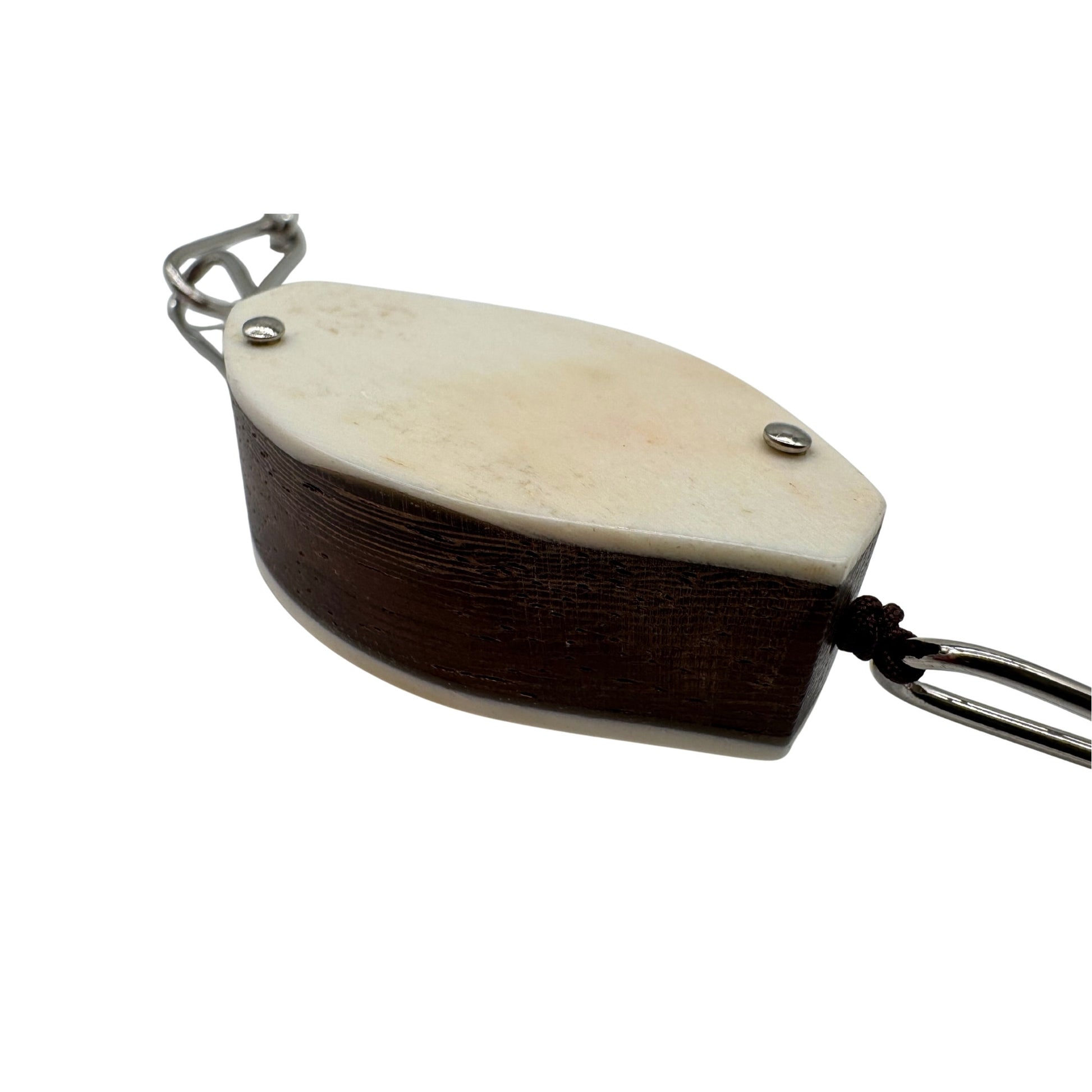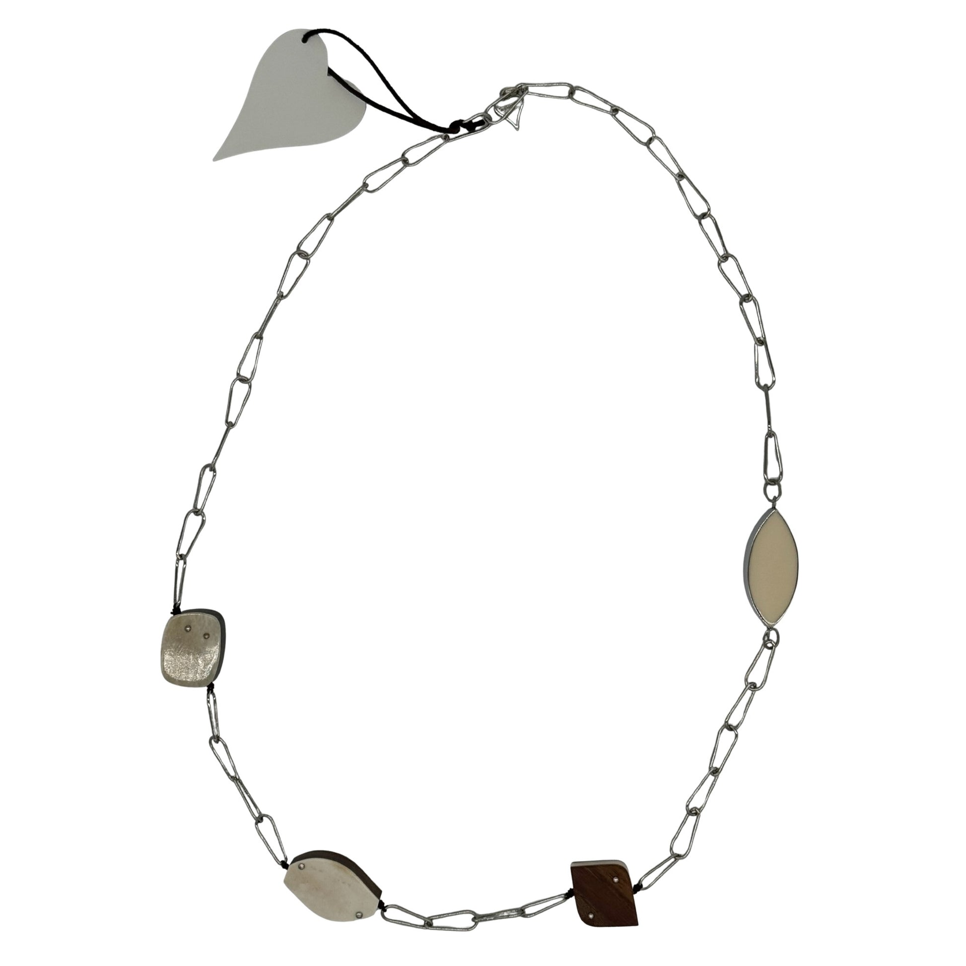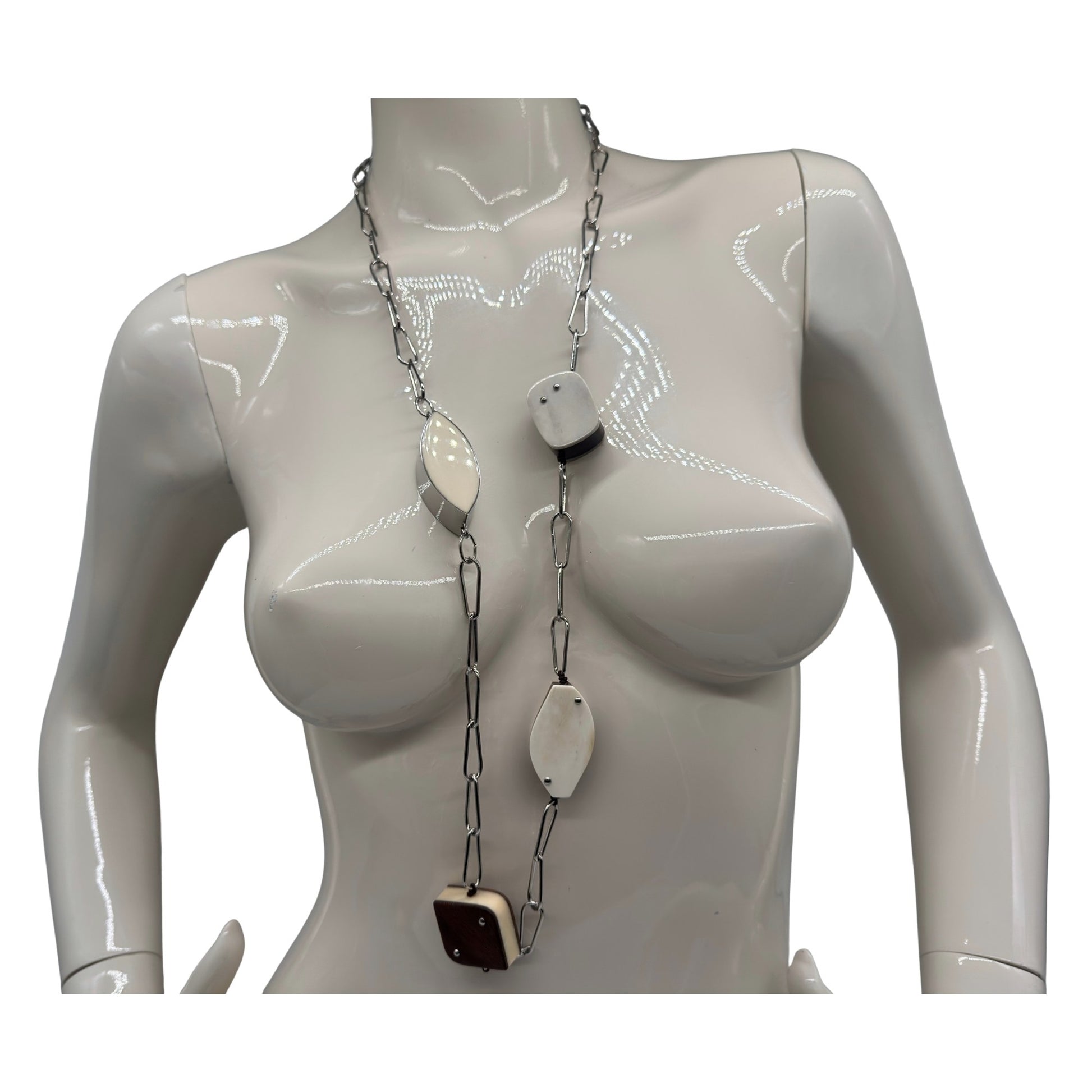 Handgefertigte Kette aus edlem Kamagong-Holz, echtem Bein und palladiumfarbener Metallkette. Die Kombination aus warmen Naturmaterialien und kühlem Metall erzeugt einen spannenden, modernen Kontrast. Die glatt gearbeiteten Holz- und Beinplatten wirken puristisch und hochwertig, während die länglichen Metallglieder der Kette eine elegante, leichte Linienführung verleihen. Ein außergewöhnliches Accessoire, das Natürlichkeit und Design perfekt verbindet.